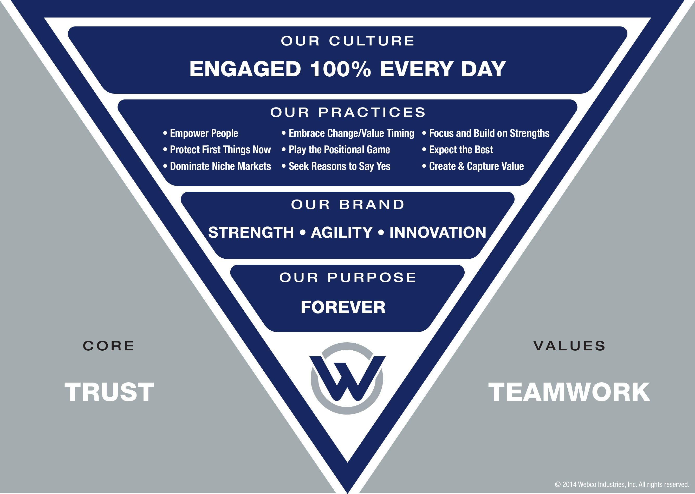 Webco has identified nine practices that round out our sixteen principles. From Empowering Our People to Expecting The Best, these practices guide us in the daily decisions we make as we strive to create more value for our customers, partners, and employees. You see them all listed in our inverted pyramid, and you will experience them every time you interact with Webco’s people or products.